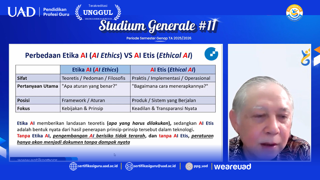Ia menjelaskan bahwa etika AI merupakan seperangkat prinsip yang mengatur bagaimana teknologi seharusnya beroperasi sesuai nilai kemanusiaan, seperti keadilan, transparansi, akuntabilitas, serta perlindungan privasi. Menariknya, Prof. Benny membedakan antara “etika AI” sebagai landasan teoritis dan “AI etis” sebagai implementasi nyata dalam teknologi.
