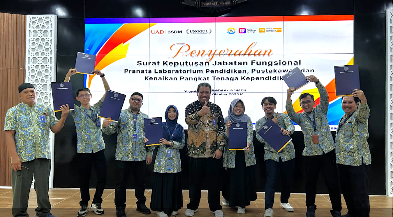 Yogyakarta – Universitas Ahmad Dahlan (UAD) terus memperkuat komitmennya dalam meningkatkan kualitas sumber daya manusia melalui penyerahan Surat Keputusan (SK) Jabatan Fungsional Pranata Laboratorium Pendidikan (PLP), pustakawan, dan kenaikan pangkat tenaga kependidikan (tendik). Acara digelar di Auditorium Kampus 1 UAD Selengkapnya …