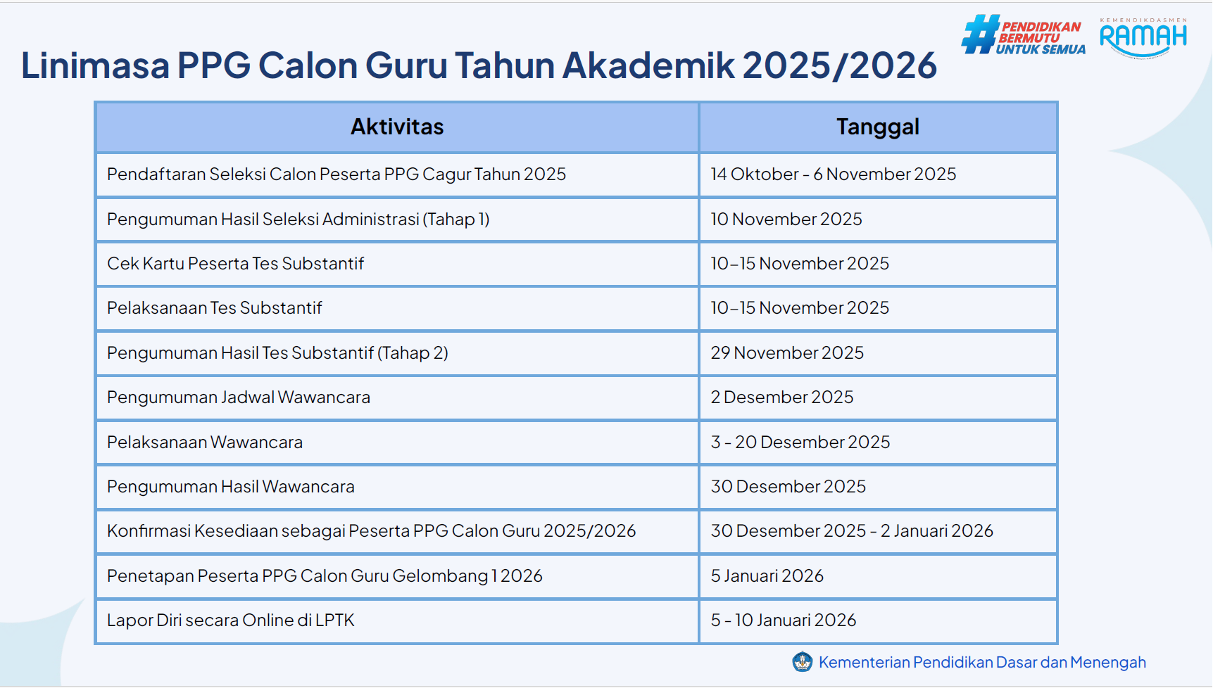 Berdasarkan Sosialisasi Pelaksanaan PPG Calon Guru Tahun 2025/2026 tanggal 29 Desember 2025, maka kami informasikan sebagai berikut :